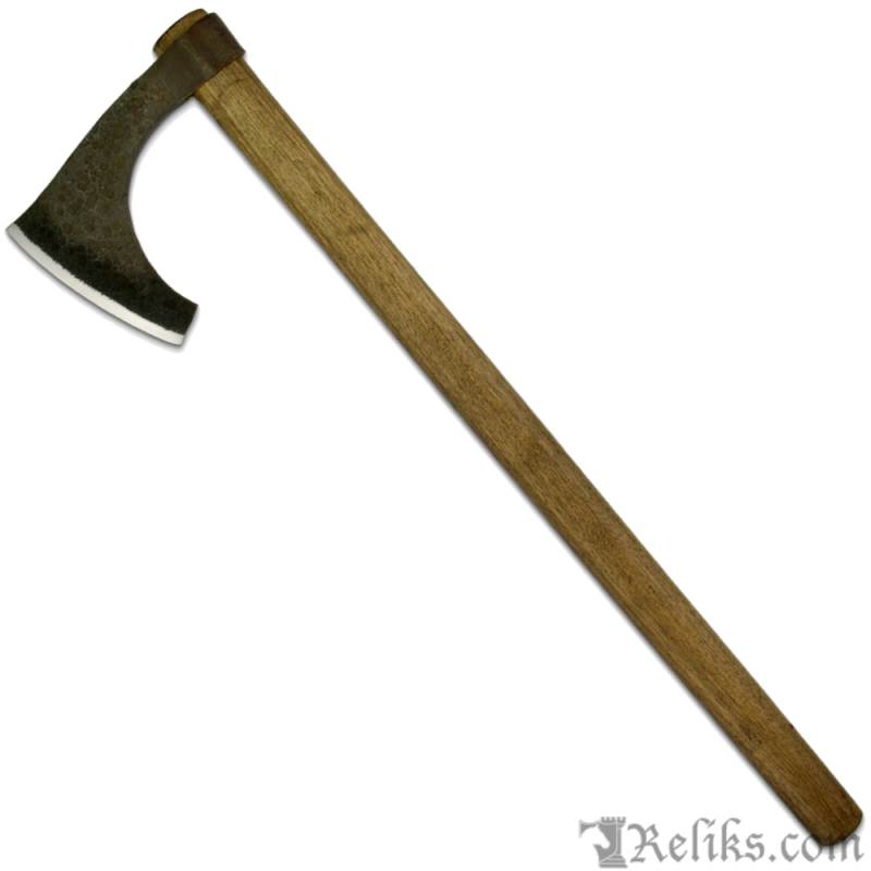 The axe features a tempered steel head with a sharp, functional edge mounted on a 30 1/2” hardwood shaft. Built for balance and durability, the bearded profile allows for both powerful strikes and finer control when choking up on the handle. The antiqued finish gives the piece the appearance of a well-worn weapon straight from the battlefield, enhancing its value for reenactors, collectors, and enthusiasts alike.