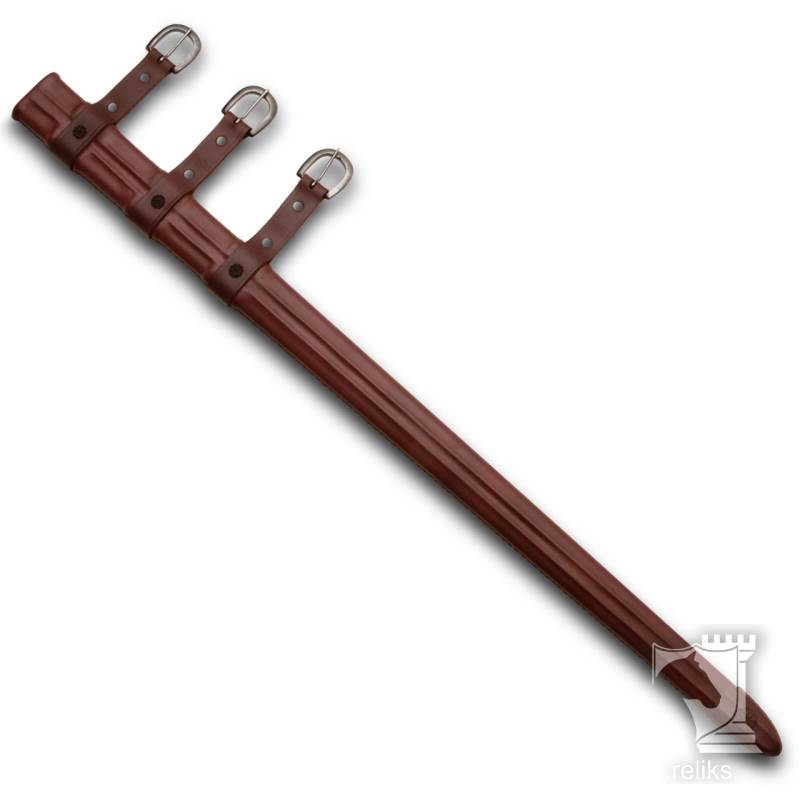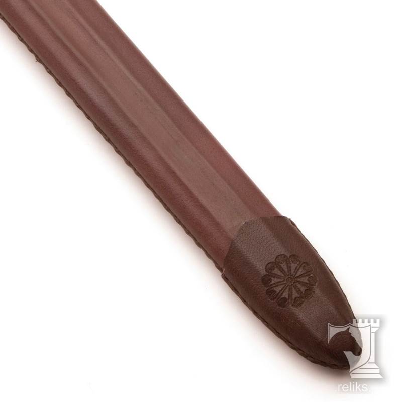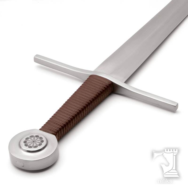 Windlass captures these historical qualities faithfully. The long blade offers the balance and geometry typical of Type XVIII swords, while the brown leather wrapped grip with raised spiral ridges echoes period examples found in collections and museums. The matching scabbard, decorated with repeating floral motifs and fitted with three hanging straps, completes the authentic knightly presentation.