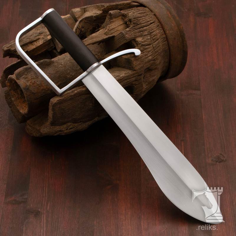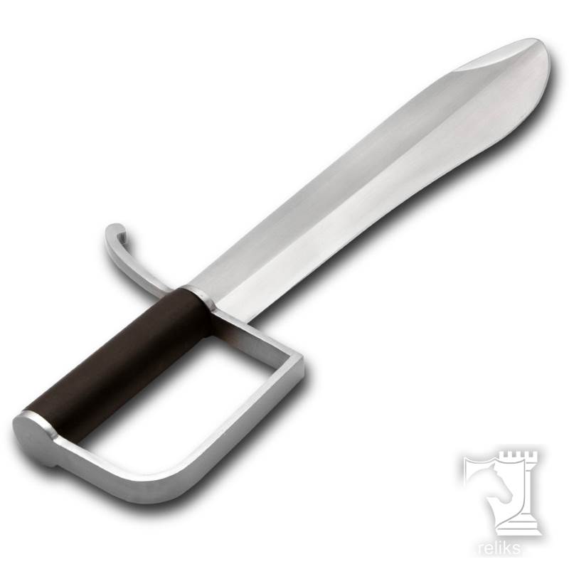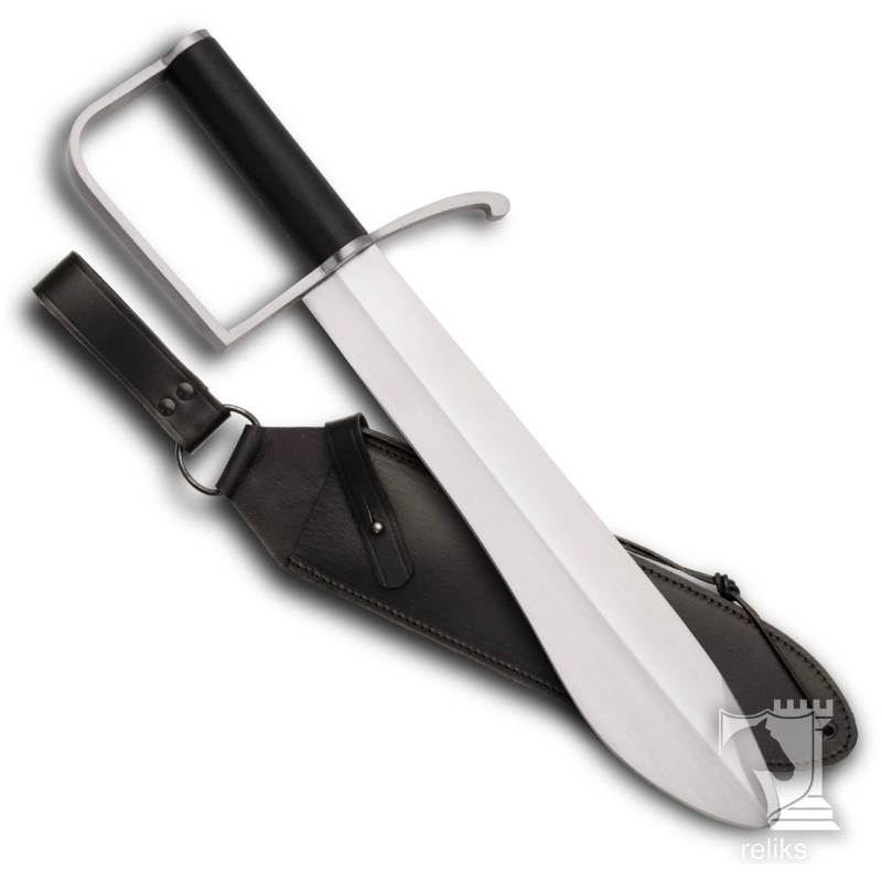 Windlass Steelcrafts has reproduced this formidable knife with care, retaining the details that made the original such a distinctive battlefield tool. The blade carries a slight distal taper for improved handling while keeping tremendous power near the hilt. Hollow-ground lower bevels and a rounded tip echo the period workmanship. The dark-stained, cylindrical wooden grip reflects common Civil War styling, while the steel D-Guard provides authoritative hand protection and that unmistakable Confederate silhouette. Unlike the original, which lacked a surviving sheath, this replica includes a black leather sheath with a ring-mounted belt loop, retaining strap, and lanyard for secure carry. The chopper arrives sharpened from the factory and ready for display or field use.