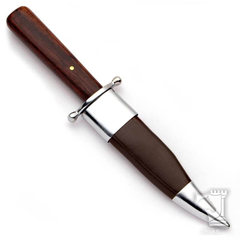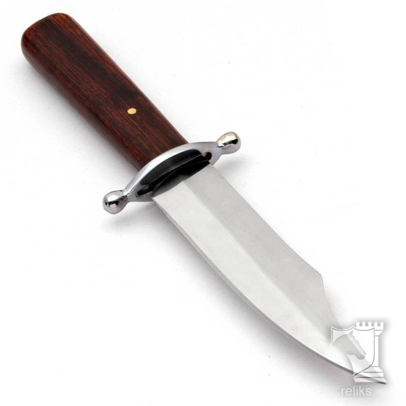 The Western boot knife is built for collectors and enthusiasts who appreciate compact frontier styled blades with honest materials and classic carry. Slim enough for the top of a boot or the back of a gun belt, this piece captures the practical spirit of the old West in a size that is easy to wear, display, or add to a period-inspired collection. It has the kind of straightforward appeal that comes from a simple fighting and utility knife design done well, with polished hardwood, a bright nickel silver guard, and a lean profile that looks right at home beside cowboy gear and historical accessories.