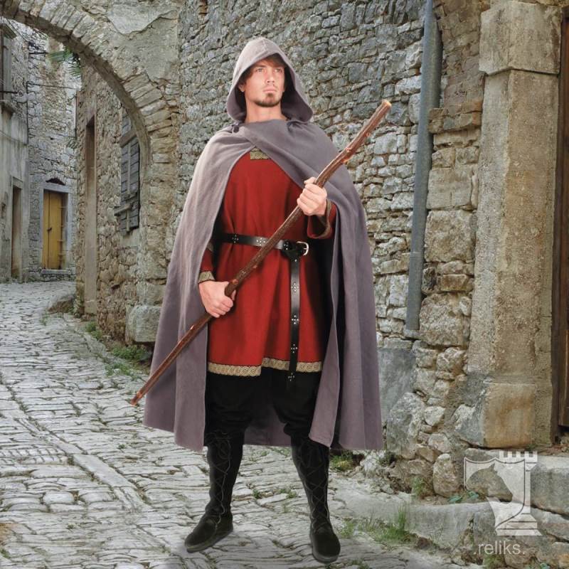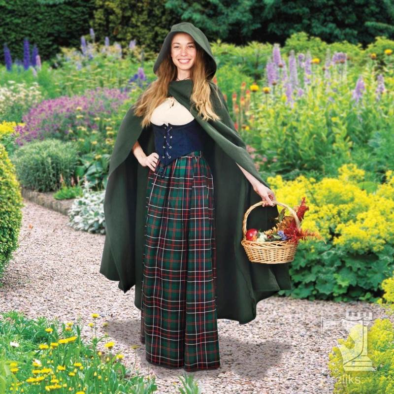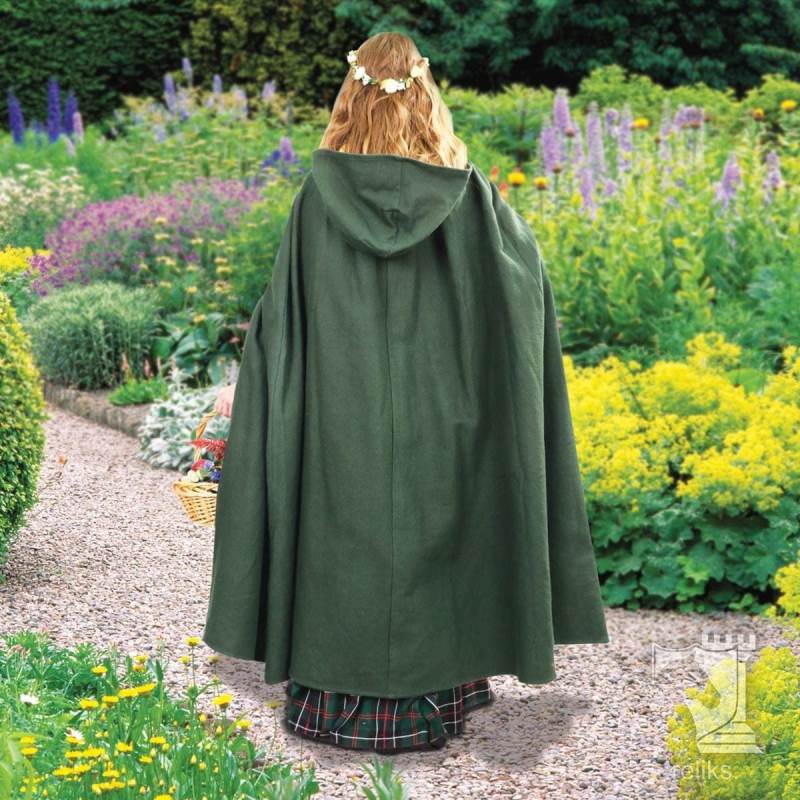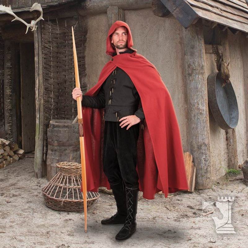 Cloaks like this were among the most practical garments of the medieval world. Worn across Europe by travellers and common folk as well as those of higher status in simpler forms, the hooded cloak offered warmth, coverage, and protection from wind and rain. A cross over front helped keep the garment close to the body while moving outdoors, making it a sensible choice for daily wear in rough conditions. This style captures that enduring appeal with a look that feels authentically medieval without becoming overly ornate, which makes it especially versatile for both historical and fantasy use.