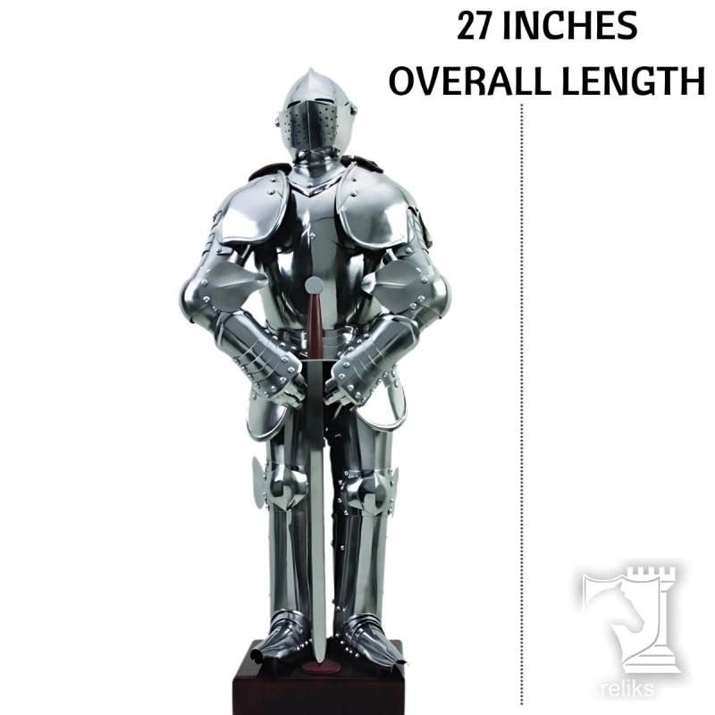 Inspired by the plate harness worn by European knights during the late medieval period, this miniature armour reflects an era when full plate became the defining symbol of the professional warrior class. By the 15th century, armourers across Europe were producing highly refined suits built for combat, ceremony and tournament, combining protection with remarkable artistry. From the visored helm to the articulated gauntlets and longsword, this reproduction draws on that historic legacy, echoing the disciplined and noble image preserved in castle collections, museums and armouries throughout Europe.