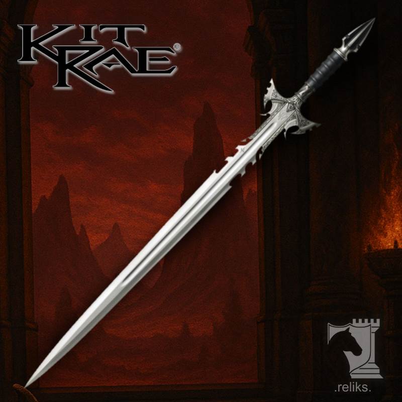 The hilt is wrought with an ornately decorated solid metal hand guard. The handle has a genuine leather wrapped grip. To counter balance the sword it is fitted with a ridged, armor piercing pommel. The AUS-6 stainless steel blade is false-edged featuring a deep fuller groove. and laser engraved Kit Rae® emblem. Serial-numbered and strictly limited to 2000 pieces worldwide! Includes a custom art print by Kit Rae and a certificate of authenticity.