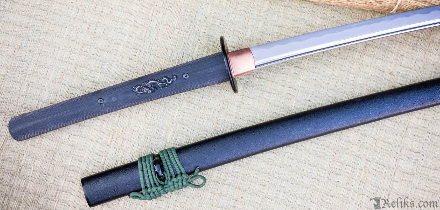 The differentially tempered 27 1/4” 1566 steel blade features a real hamon line with a copper habaki and seppa. The tsuka encapsulates the tang in textured G10 and is dual pinned for a secure grip which is unremovable. The silver menuki on the tsuka are dragons which are embedded in the handle. The textured black saya features an olive paracord sageo around a polymer kurikata and kojiri. The Modern Katana also has the Modern Tanto and Modern Wakizashi as companion pieces to complete your modern warrior collection.