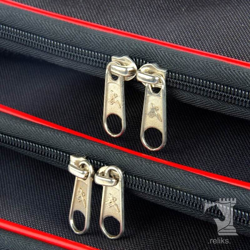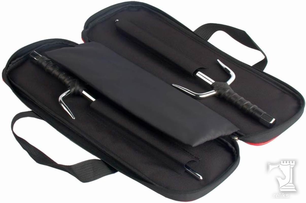 Constructed from sturdy black nylon with a smooth-gliding zipper closure, this case is designed for long-term durability. A soft divider flap keeps the pair of sai from coming into contact, preventing scuffs and dents. Measuring 22.5 inches overall, it comfortably fits most standard sai used in traditional Kobudo. Please note that sai are not included.