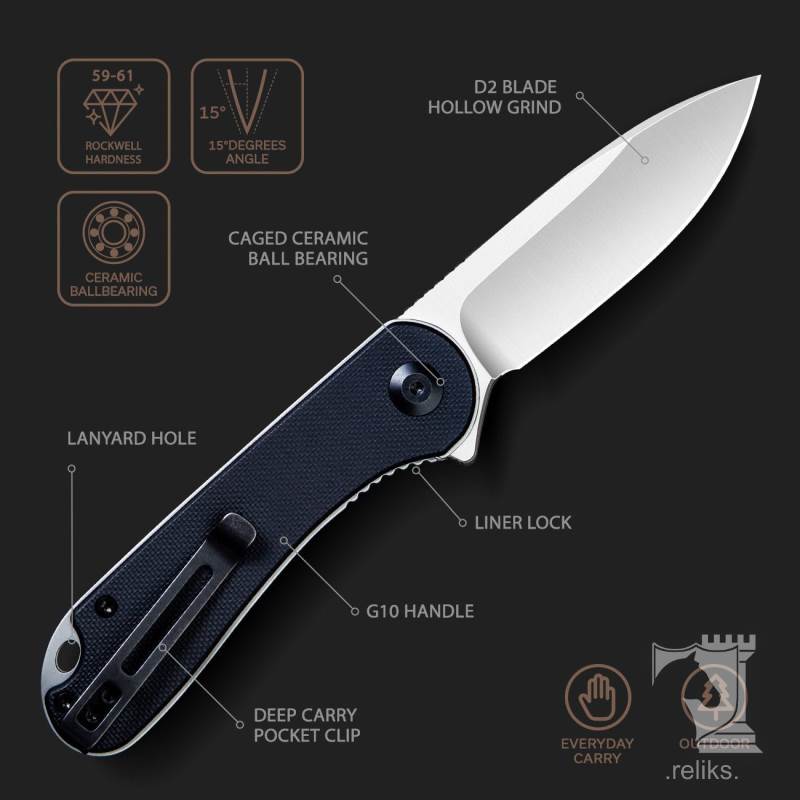 This Elementum features a 2.96 inch D2 steel blade with a hollow grind and satin finish, delivering strong edge retention and precise cutting performance. The caged ceramic ball bearing pivot ensures fast, smooth blade deployment, while the liner lock provides secure lockup during use. Stainless steel liners and hardware add durability without unnecessary weight, and the slim G10 handle keeps the knife comfortable in hand and discreet in the pocket. Every detail is designed to support dependable daily use with long term durability.