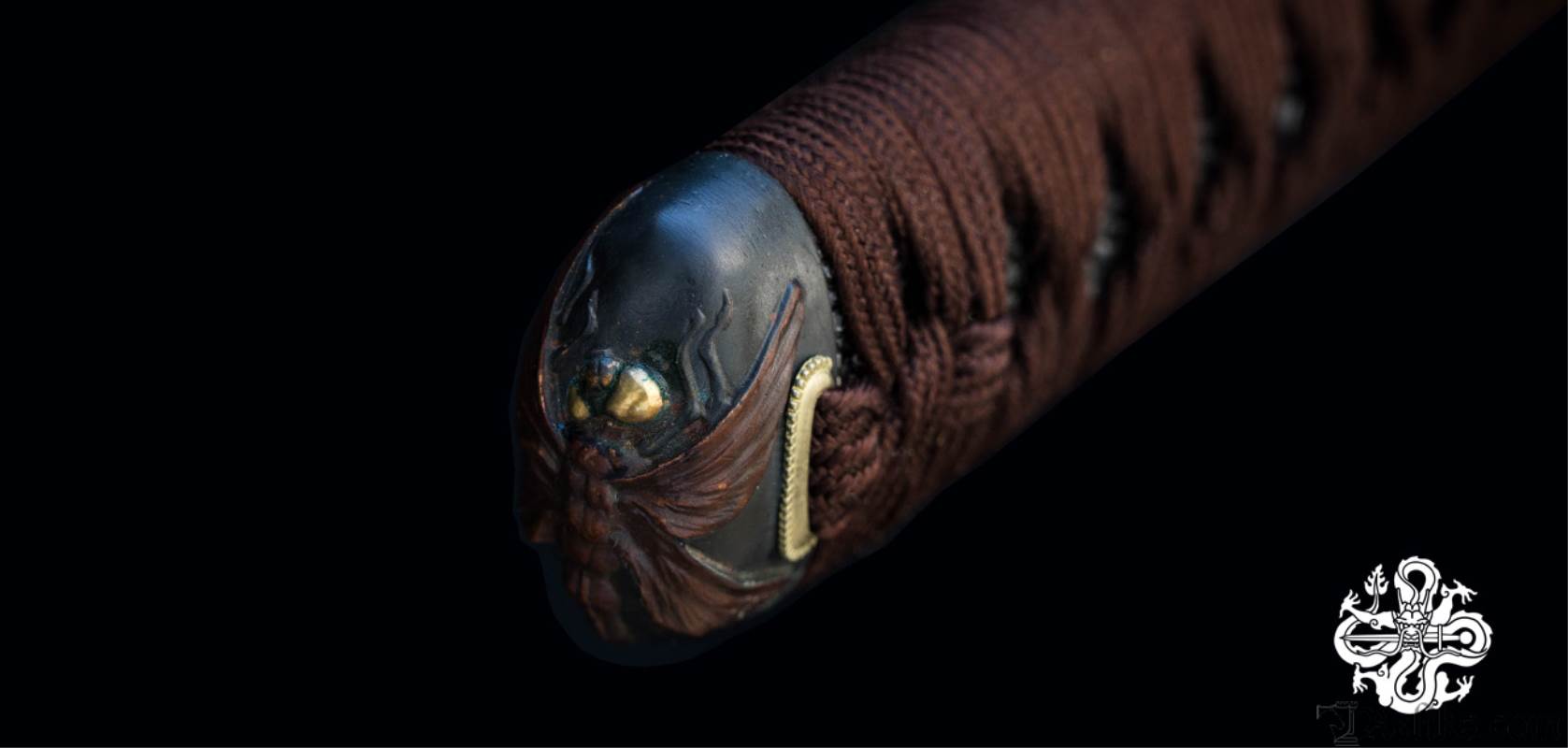 The dark brown Japanese silk ito is set off by the black same making this a unique offering. The lower shinogi and the scant hira-niku make this blade lighter and faster, and gives it less resistance when cutting soft targets. The tsuka has the slight “waisting”, ryugo, that is popular with many who study Japanese sword arts.