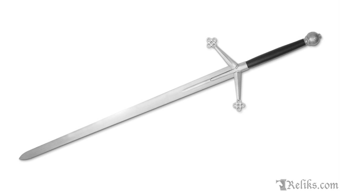 Mainstay of the Highland warriors of the late 15th and 16th centuries, the Claymore had a uniquely styled hilt that sets it apart from other great swords of the period. Typically of hand-and-a-half length, this versatile weapon could deliver great sweeping slashes or powerful thrusts. Replicated from a surviving museum piece our Highland Claymore is classic in its design, with distinctive sloping quillons terminating in quatrefoils and a high-collared quillon block with langets following the blade #fuller. The leather-covered grip is topped by a globate pommel.