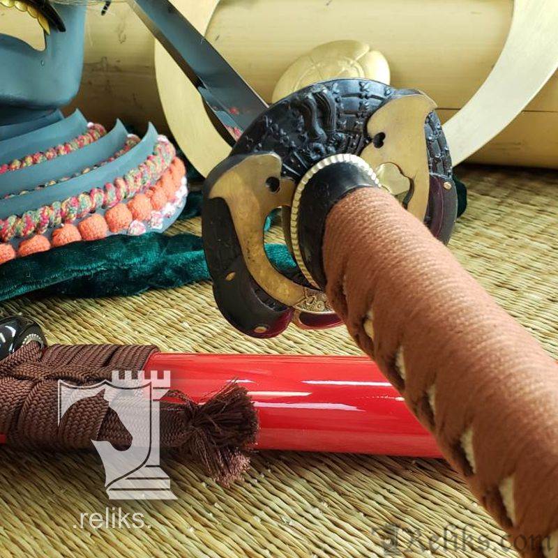 The centerpiece of this weapon is its 28 ½” forged steel blade, housed in a red lacquered saya symbolizing the blood spilled in pursuit of Nobunaga’s ambition. The saya is completed with a buffalo horn kurikata and kojiri, tied with a brown sageo that complements the brown tsuka-ito wrapped over white same (ray skin). Together, the copper-toned furniture, menuki, and symbolic motifs create a seamless harmony of art and function. The Tenka Fubu Katana is not only a collectible masterpiece but also a fully functional blade—one that Oda Nobunaga himself would have been proud to carry into battle.