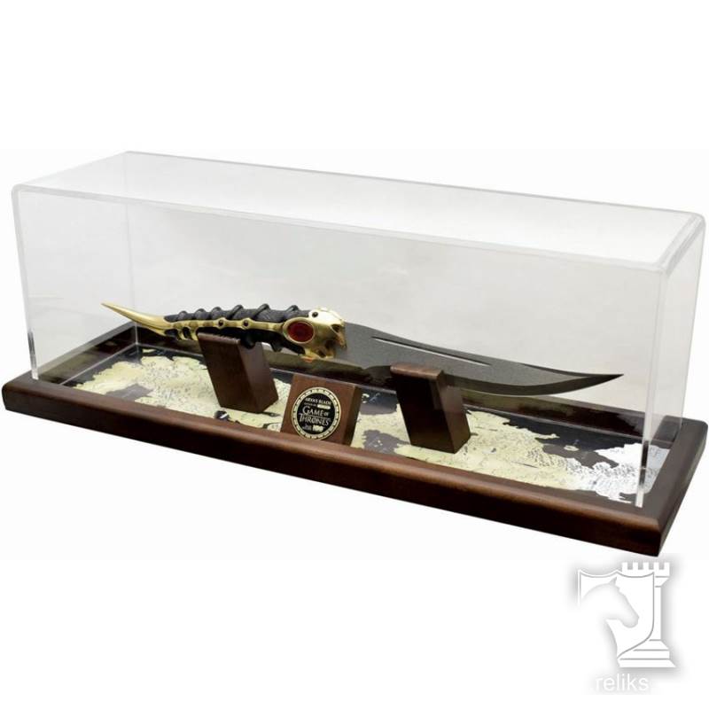 Arya’s Blade is one of the most significant weapons in Game of Thrones, a dagger whose journey shaped the entire history of the Seven Kingdoms. This officially licensed replica captures the elegant shape, dragonbone-style grip, and distinctive gold accents of the blade seen on screen. Whether displayed with its protective dome or showcased as part of a full collection, this piece brings one of the series’ most iconic moments right into your home.