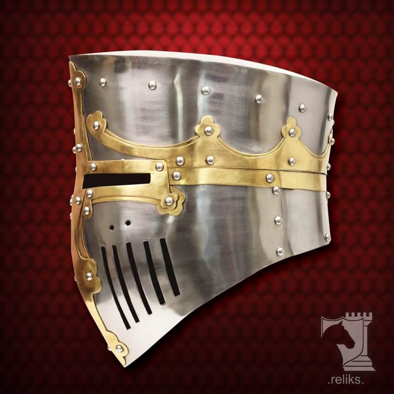Helmet of Castile is a striking medieval great helm replica for collectors, historical enthusiasts, and armour displays that call for real presence. With its bold 13th century profile, decorative brass accents, and commanding faceplate, this helm captures the powerful look associated with European knights of the high Middle Ages. Whether displayed in an office, armoury, library, or medieval interior, it delivers the kind of visual impact that immediately evokes the age of crusades, kingdoms, and mounted warfare.