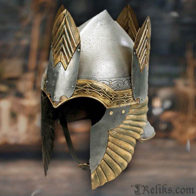 In J.R.R. Tolkien’s lore and New Line Cinema’s film adaptation, Elendil fell in the final battle against Sauron, and his son Isildur took up the broken hilt of Narsil to strike the Dark Lord. This helm recalls the line of Númenórean kings, echoing the design worn in the prologue of The Fellowship of the Ring. The brass embellishments, weathered finish, and bold silhouette make it instantly recognizable to fans who remember that pivotal moment when the One Ring was cut from Sauron’s hand.