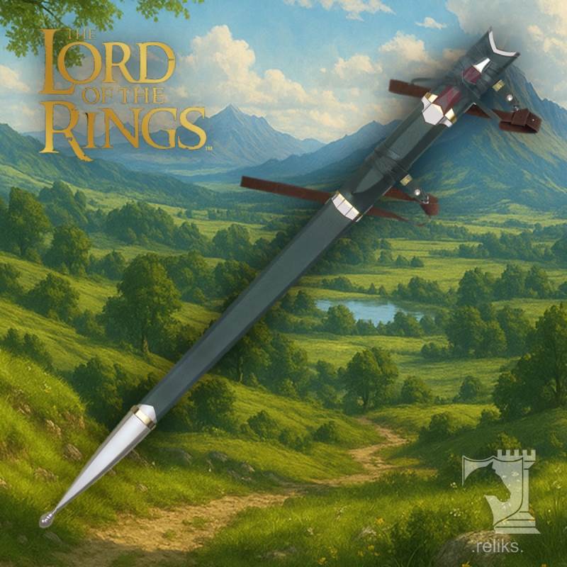 This authentically detailed replica is a reproduction of the original filming prop, recreated by master craftsmen with precision and care. The scabbard features a genuine leather wrap with sturdy straps, complemented by solid metal fittings, buckles, and tip in an antiqued brass and steel finish. Attached to its side is a companion hunting knife in its own sheath—an essential detail taken straight from The Fellowship of the Ring, where Strider uses it to cut the Kingsfoil plant to slow Frodo’s descent into darkness after the Morgul blade wound.