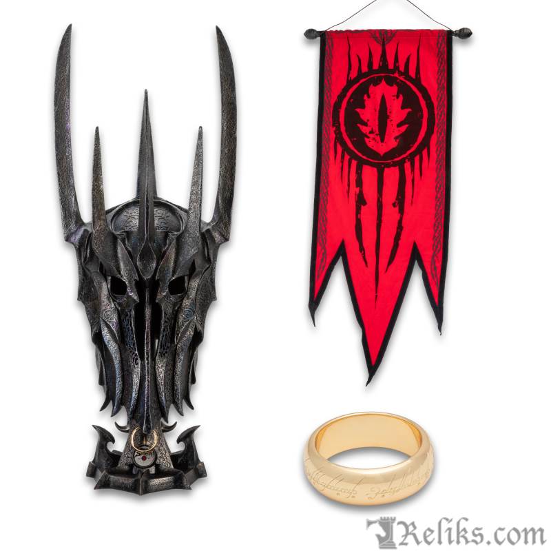 Each helm is cast in reinforced polyresin with a padded, genuine leather-lined interior for added realism. Standing 30 inches tall, it rests on a custom wood and polystone display stand. The set includes a Sauron-scale One Ring replica, a fabric war banner emblazoned with the Eye of Sauron, and a certificate of authenticity. Individually serial-numbered and produced in strictly limited quantities, this collector’s piece is more than a replica—it is an heirloom tribute to the enduring legacy of Middle-earth.