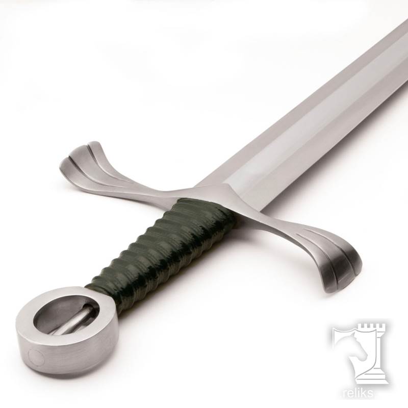 Windlass Steelcrafts brings this historic design back with faithful styling and modern refinements. The wide fuller echoes original examples, reducing weight without sacrificing strength, while the richly dyed green leather on the grip and scabbard reflects colours long associated with Irish identity. Even in low light, the near black hue hints at its heritage without appearing overly decorative, just as a working sword of the age would have.
