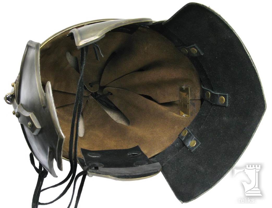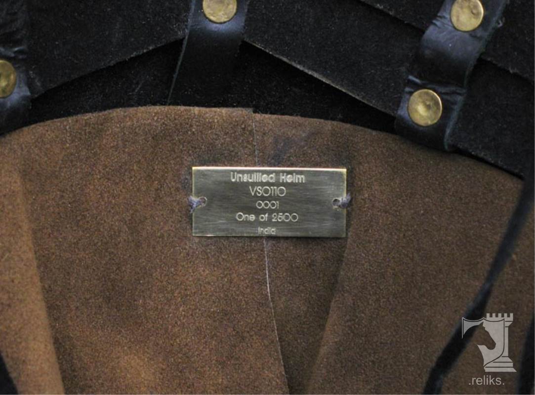 The helm is constructed from leather and steel and includes an adjustable visor.